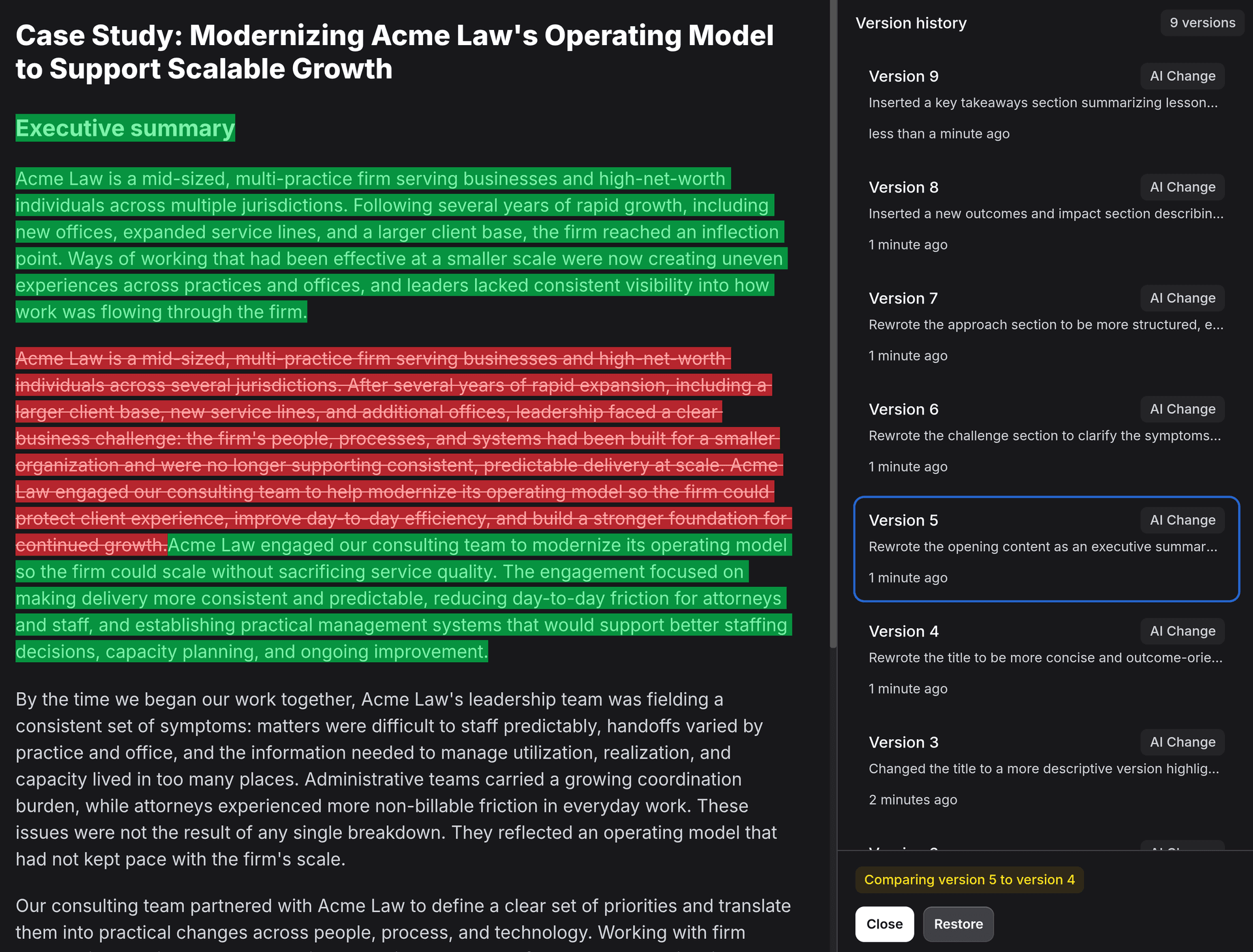 Compare revision history, inspect diffs, and restore prior drafts when release requirements shift late.
